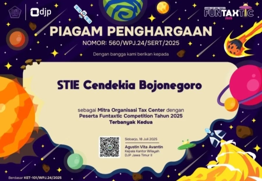 “Atas nama STIE Cendekia Bojonegoro, kami mengucapkan terima kasih atas pengakuan dan apresiasi yang diberikan kepada kami dalam ajang kompetisi nasional ini. Partisipasi kami adalah wujud komitmen nyata untuk terus mengedukasi mahasiswa tentang pentingnya pajak bagi pembangunan negara,” ujar Dra. Susilowati Rahayu, MM..