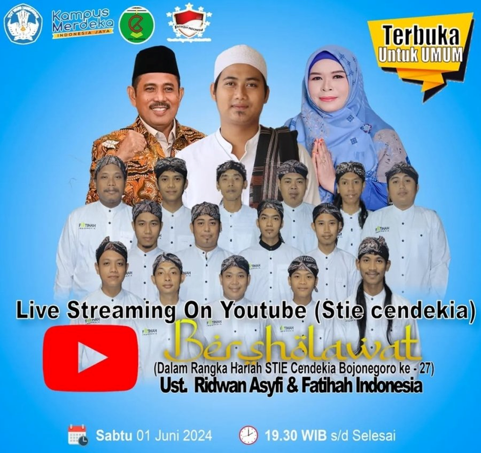 Bojonegoro, 1 Juni 2024 – Suasana penuh khidmat dan keberkahan menyelimuti kampus STIE Cendekia Bojonegoro saat digelarnya acara Bersholawat bersama Ustadz Ridwan Asyfi dan grup sholawat Al-Fatihah Indonesia, Sabtu malam (1/6). Kegiatan ini merupakan bagian dari rangkaian peringatan Hari Lahir STIE Cendekia yang ke-27.